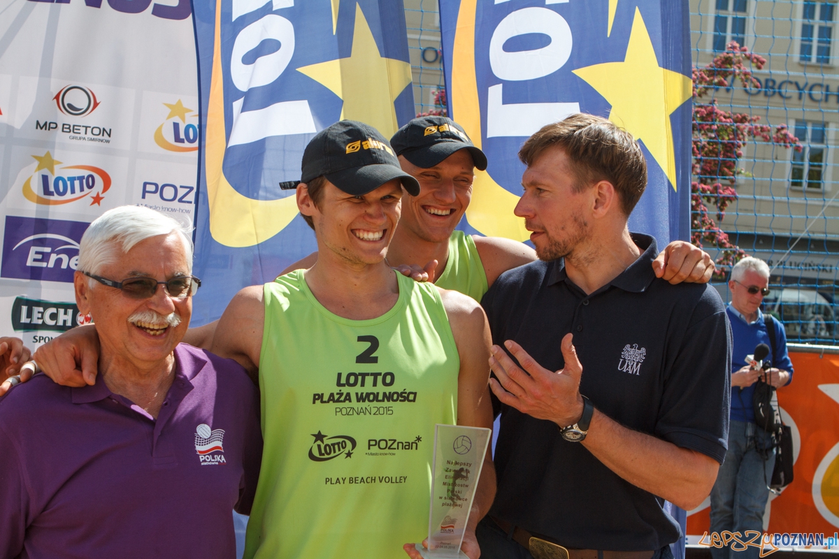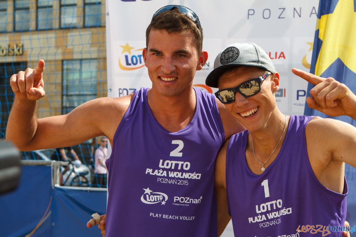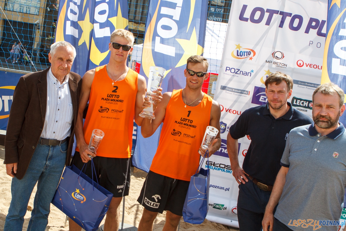 Plaża Wolności 2015 – mecz finałowy – Michał Bryl i Kacper Kujawiak vs Jędrzej Brożyniak i Bartłomiej Dzikowicz zakończył się wynikiem 2:0 (21:16, 21:13). Poznań 24.05.2015 r.