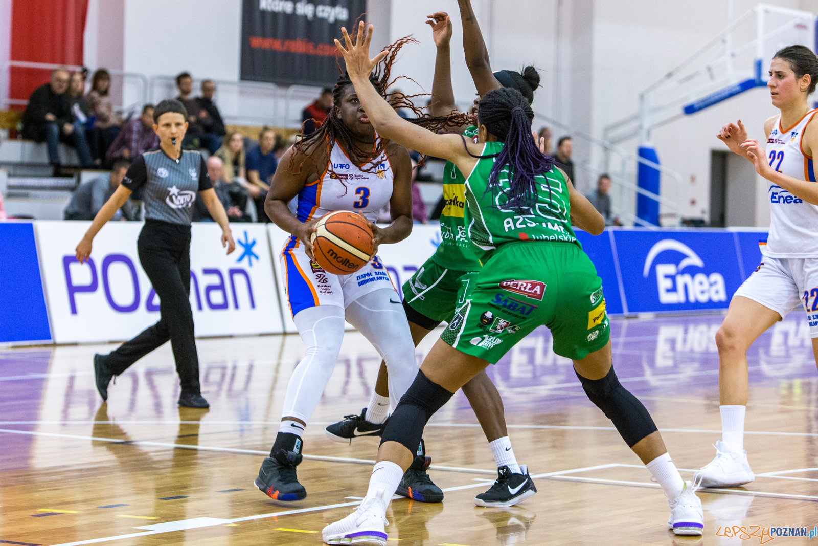 W trzeciej kwarcie swój koncert na boisku rozpoczęła rozgrywająca Enea AZS – Zakyia Saunders. Grała pod koszem i na obwodzie, skutecznie obsługując koleżanki. Zakyia była najskuteczniejszą zawodniczką gospodarzy, zdobywając w całym meczu 22 punkty. Do tego dołożyła 8 asyst, 2 przechwyty i 3 zbiórki. Akademiczki zarówno z Poznania, jak i z Lublina w tej części spotkania grały bardzo skutecznie. Kwarta skończyła się wysokim wynikiem 26:29 dla Pszczółek, jednak to Enea AZS przed ostatnią kwartą miała 1 punktową przewagę (64:63). Pod koniec trzeciej kwarty ławkę trenerską musiał opuścić trener Elmedin Omanić, ukarany 2 faulami technicznym. Stery w zespole gospodyń przejął asystent Marek Lebiedziński.