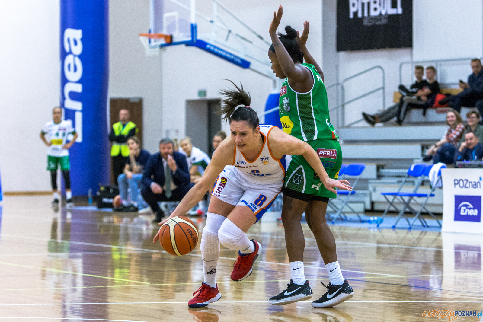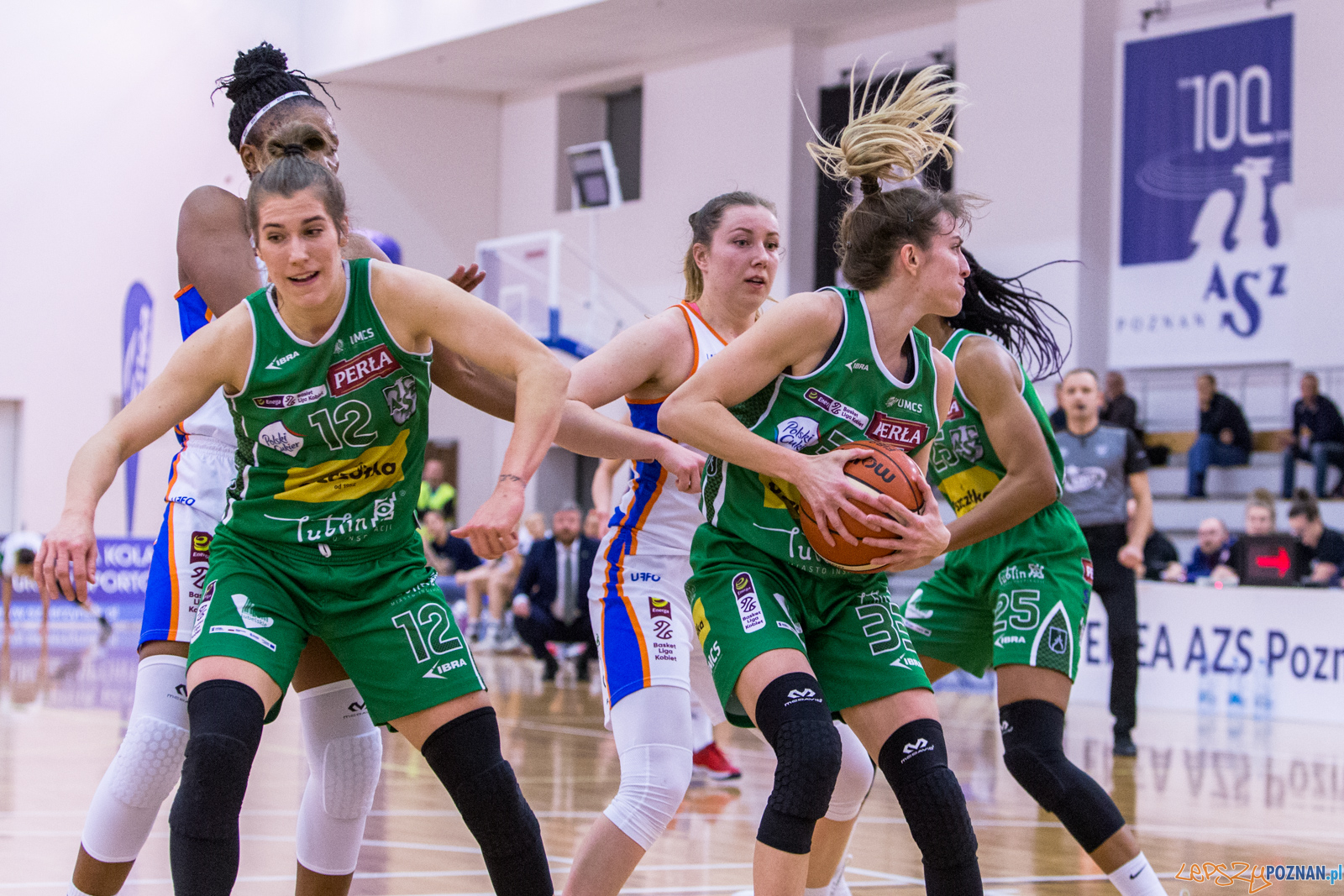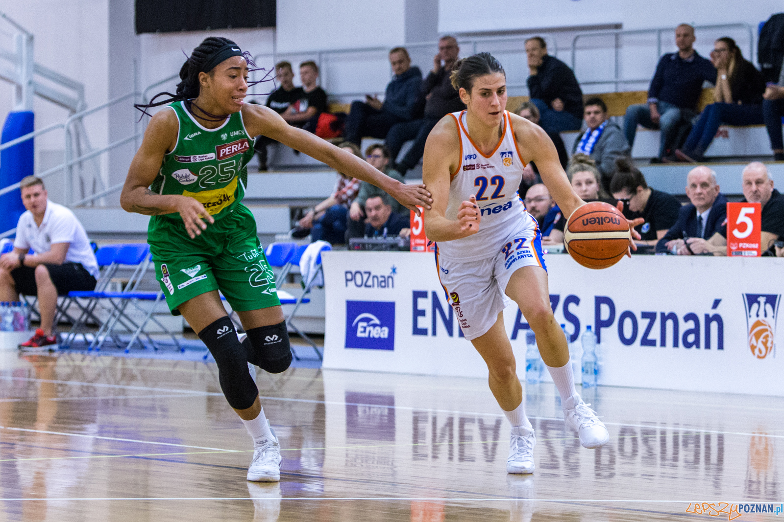 Akademiczki z Poznania rozpoczęły spotkanie bardzo skoncentrowane wychodząc szybko na kilku-punktowe prowadzenie. Wynik otworzyła celnym layupem z kontry Milana Zivadinović, która w całym meczu zagrała na 11 punktów i 10 asyst. Pierwsza kwarta, tak jak cały mecz, obfitowała w dużą ilość fauli. Już w 5 minucie meczu najpierw środkowa z Lublina Briana Day opuściła boisko z 3 faulami, a po minucie na ławce usiadła z 3 faulami środkowa z Poznania Ginette Mfutila. Zespoły szybko przekroczyły limity 5 fauli i zawodniczki z obu stron często stawały na linii rzutów wolnych. Enea AZS grała bardzo skutecznie zarówno w obronie, jak i w ataku stąd zasłużenie wygrała pierwszą kwartę 18:15.