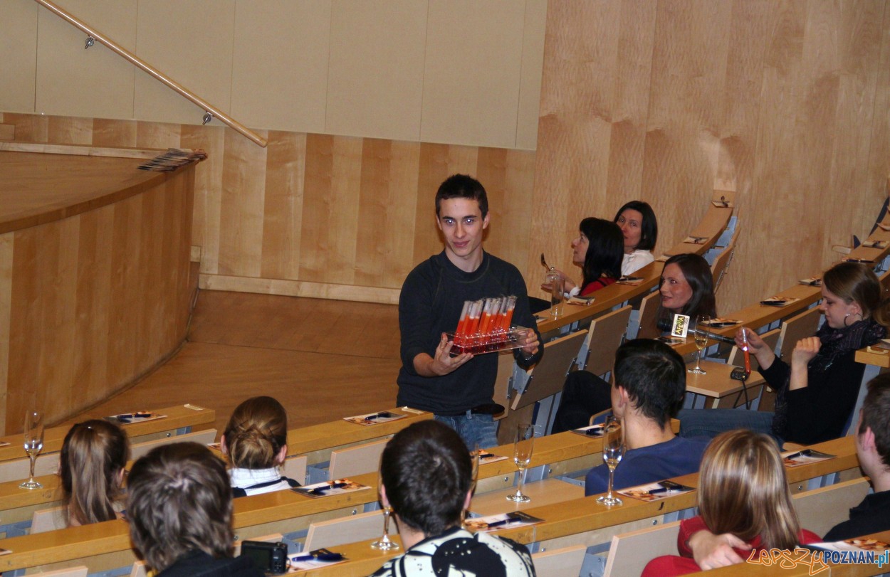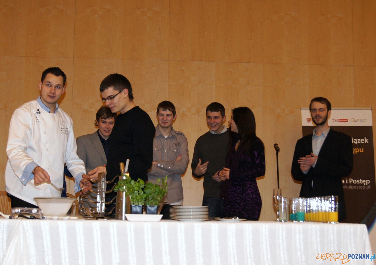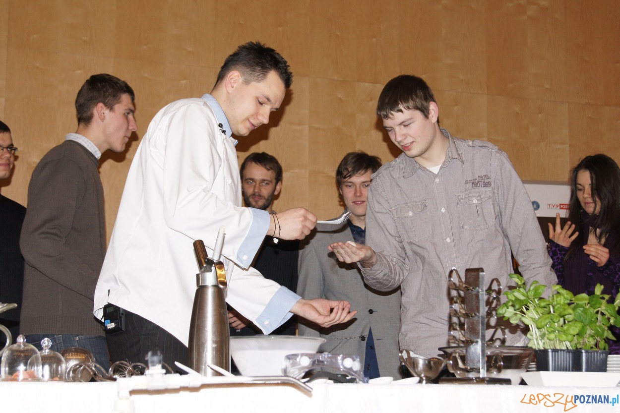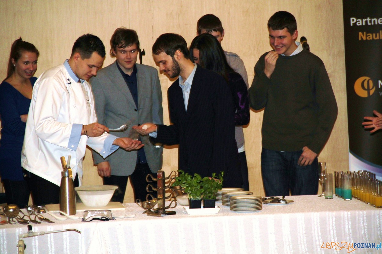 Podczas tego pierwszego spotkania na Politechnice Poznańskiej zobaczyliśmy jak tworzona jest kuchnia molekularna, a ci, którzy byli wystarczająco odważni, mogli też przekonać się jak smakują tak przygotowane potrawy. Chętnych nie brakowało, choć część kosztowała dziwnie wyglądające napoje… ostrożnie.