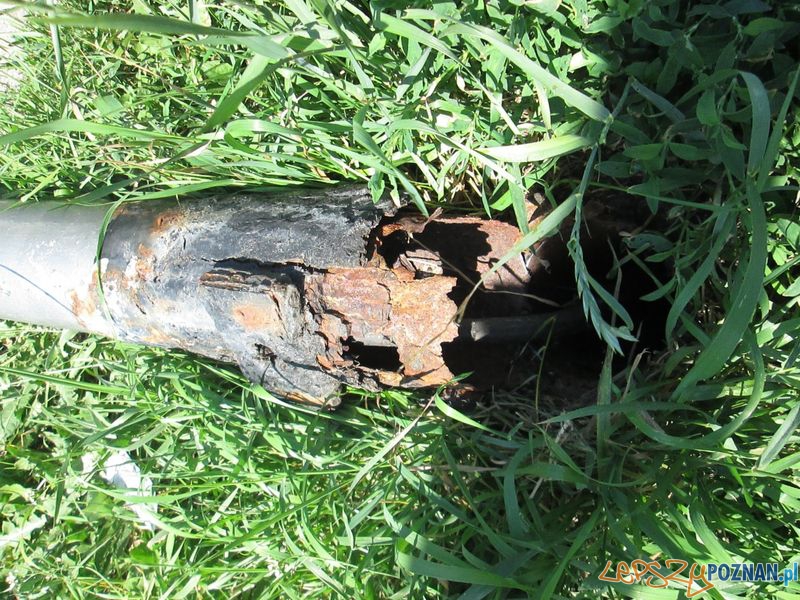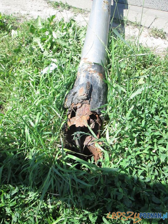Wiatru nie było ni nikt nie spodziewał się, że zardzewiała rura przewróci się wprost na auto. Na szczęście nikomu nic się nie stało tylko samochód nadaje się do gruntownego remontu. Sygnalizacja w mieście know how chyba też!