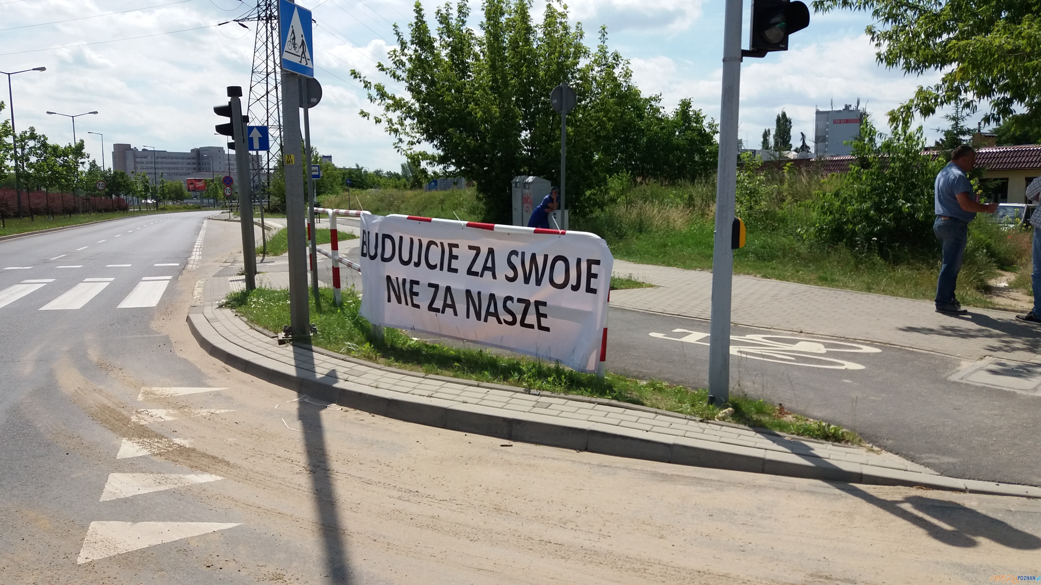 Kilkanaście osób protestuje przy budowie jednego z osiedli na Ratajach. Domagają się zaległych pieniędzy za wykonane prace.