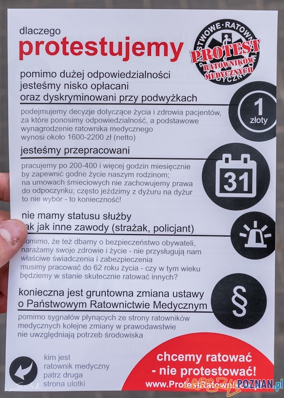 Ratownicy medyczni rozdawali dziś na ulicach Poznania ulotki informując o swojej trudnej pracy i niskich wynagrodzeniach. Na ręce wojewody Wielkopolskiego złożyli także pismo – protest. Akcja jest częścią ogólnopolskiego protestu ratowników medycznych.