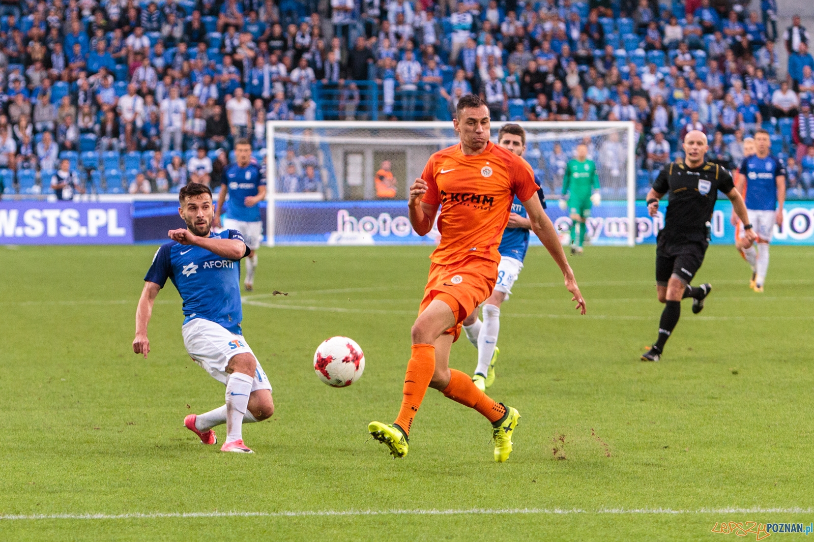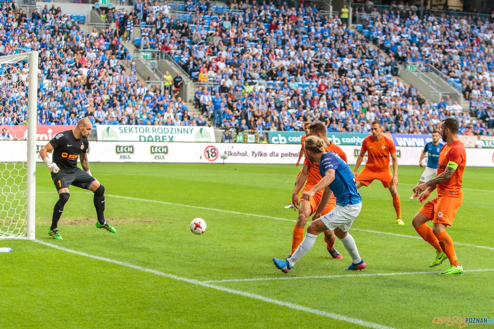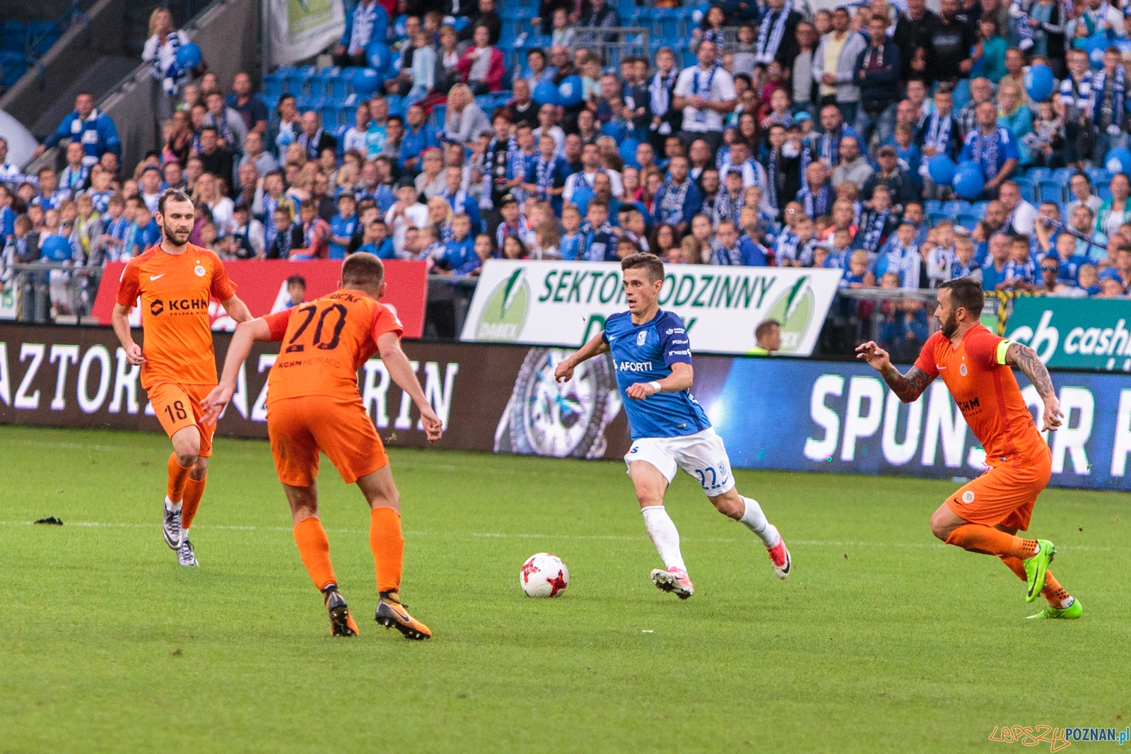 Pierwsze do ataku przystąpiło Zagłębie. W pierwszej minucie meczu strzał Alana Czerwińskiego obronił Matus Putnocky. W odpowiedzi na bramkę rywali uderzał Majewski, ale jego strzał nawet nie leciał w światło bramki. W 17. minucie Situm zagrał do wbiegającego w szesnastkę Kostevycha, a ten zagrał do Majewskiego. Pomocnik Kolejorza trafił jednak w nogi Kubickiego, który natychmiast wybił piłkę z szesnastki Zagłębia. W odpowiedzi, jedenaście minut później, ładną akcję przeprowadził Świerczok. Napastnik lubinian zbiegł do środka pola i uderzył na bramkę, a piłka trafiła w poprzeczkę. W polu karnym gości dwoił się i troił Gytkjaer, który w 36. minucie sam wykreował sytuację strzelecką – odebrał piłkę rywalowi i uderzył z ostrego kąta na bramkę, jednak futbolówka nie znalazła się w siatce. Dobrą sytuację w 43. minucie miał też Starzyński. Pomocnik Zagłębia strzelał z wolnego, ale nie trafił nawet w bramkę.