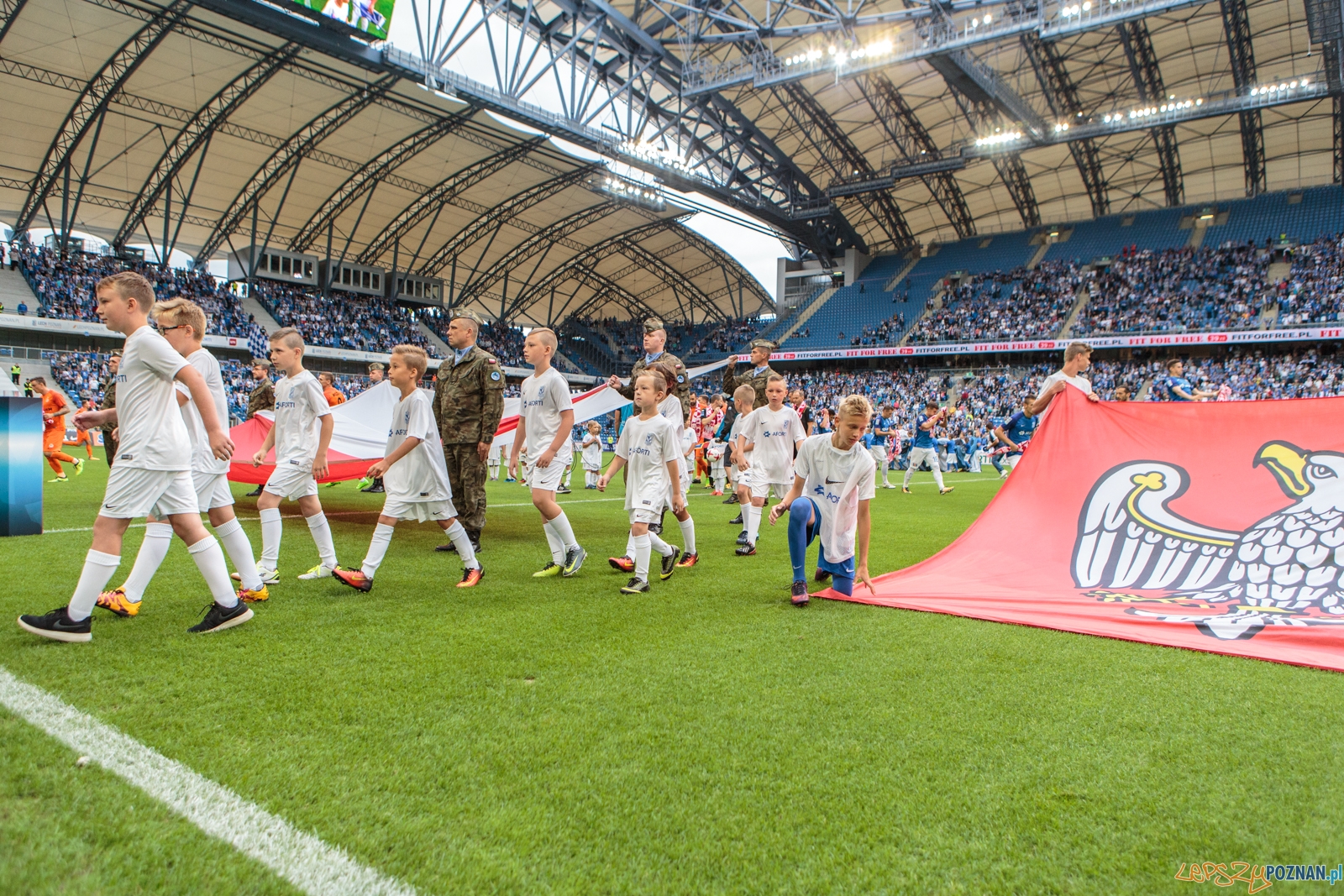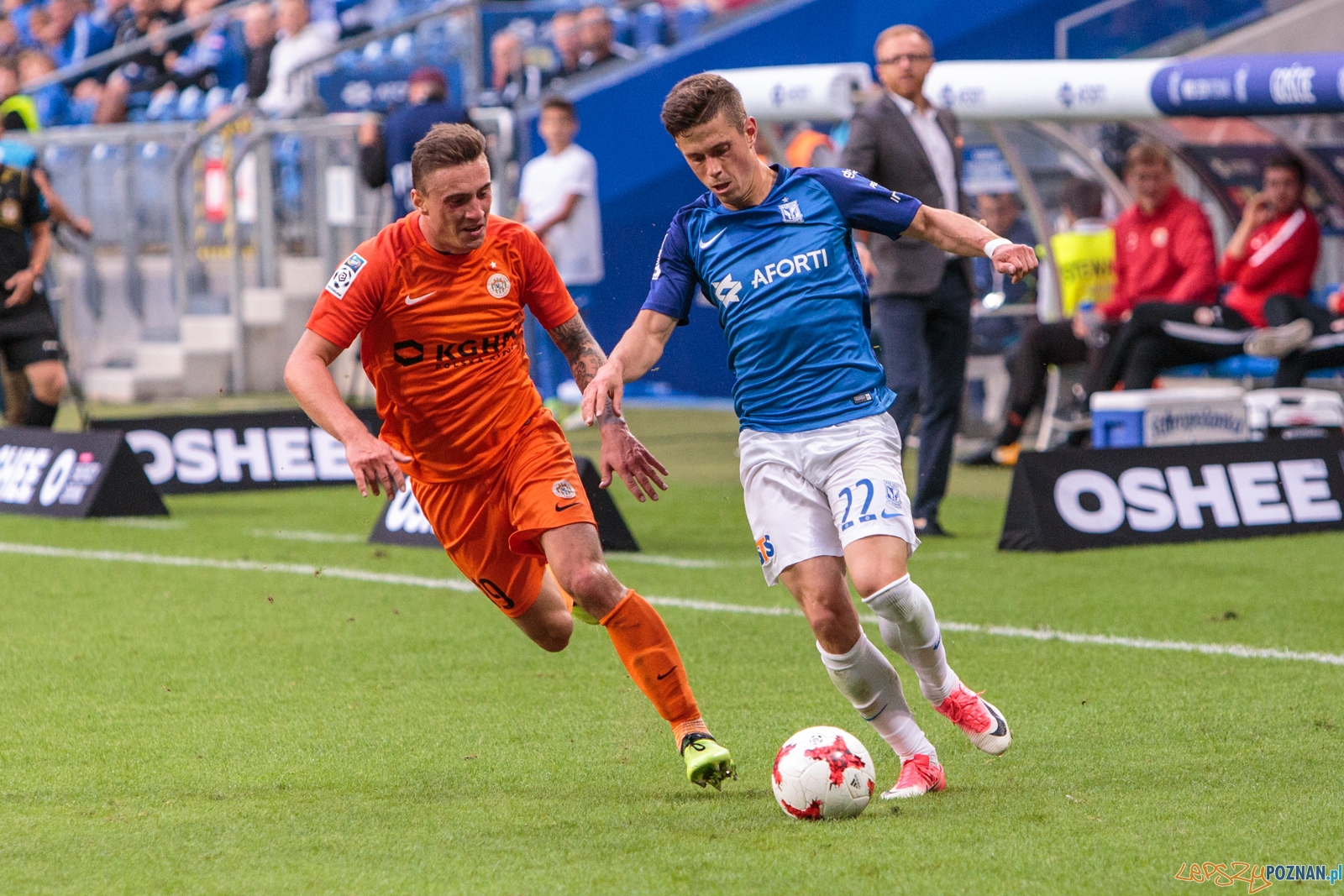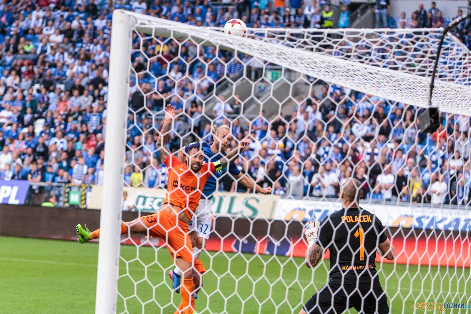 Pierwsze do ataku przystąpiło Zagłębie. W pierwszej minucie meczu strzał Alana Czerwińskiego obronił Matus Putnocky. W odpowiedzi na bramkę rywali uderzał Majewski, ale jego strzał nawet nie leciał w światło bramki. W 17. minucie Situm zagrał do wbiegającego w szesnastkę Kostevycha, a ten zagrał do Majewskiego. Pomocnik Kolejorza trafił jednak w nogi Kubickiego, który natychmiast wybił piłkę z szesnastki Zagłębia. W odpowiedzi, jedenaście minut później, ładną akcję przeprowadził Świerczok. Napastnik lubinian zbiegł do środka pola i uderzył na bramkę, a piłka trafiła w poprzeczkę. W polu karnym gości dwoił się i troił Gytkjaer, który w 36. minucie sam wykreował sytuację strzelecką – odebrał piłkę rywalowi i uderzył z ostrego kąta na bramkę, jednak futbolówka nie znalazła się w siatce. Dobrą sytuację w 43. minucie miał też Starzyński. Pomocnik Zagłębia strzelał z wolnego, ale nie trafił nawet w bramkę.
