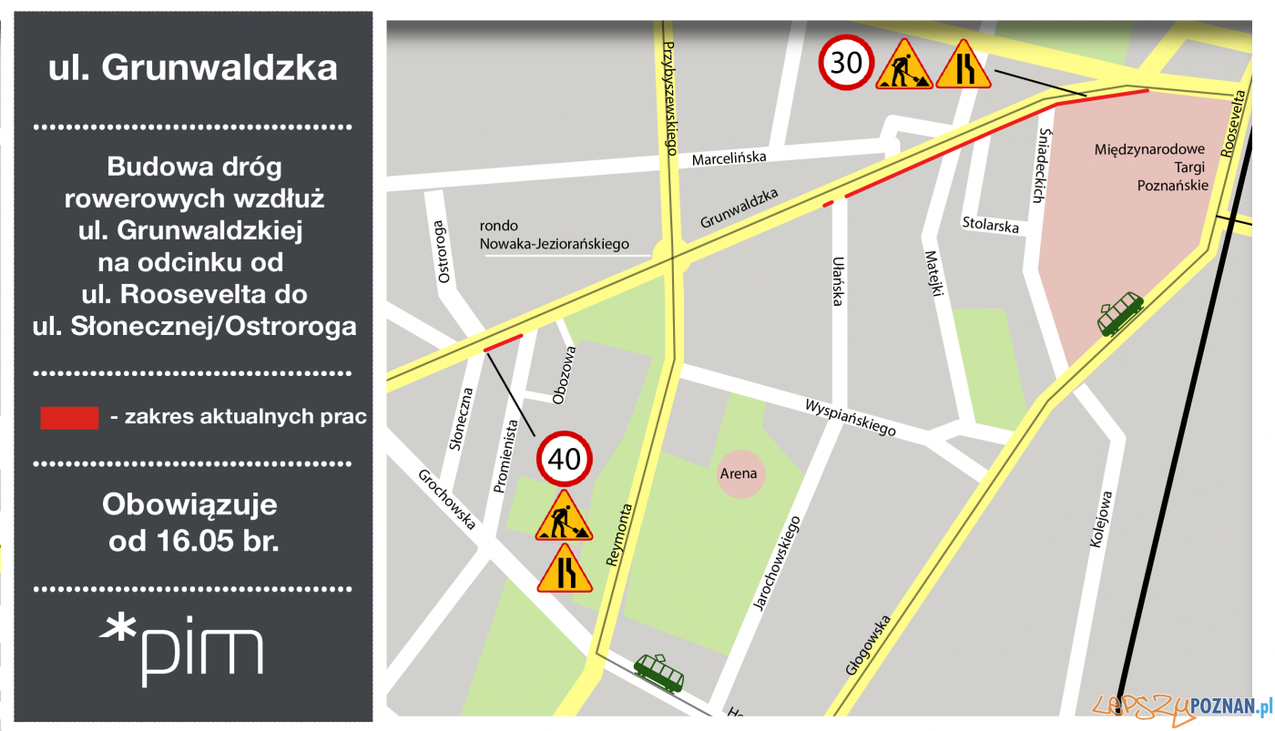 Efektem prac prowadzonych na ul. Grunwaldzkiej będzie powstanie jednej z najważniejszych i najbardziej wyczekiwanych przez rowerzystów tras w stolicy Wielkopolski. Już pod koniec roku będą mogli korzystać z dwukierunkowej drogi rowerowej z nawierzchnią bitumiczną. Wzdłuż trasy pojawią się nowe elementy małej architektury. Sposób parkowania pojazdów zmieni się na równoległy, a zatoki postojowe zostaną przebudowane i otrzymają nową nawierzchnię z kostki betonowej.