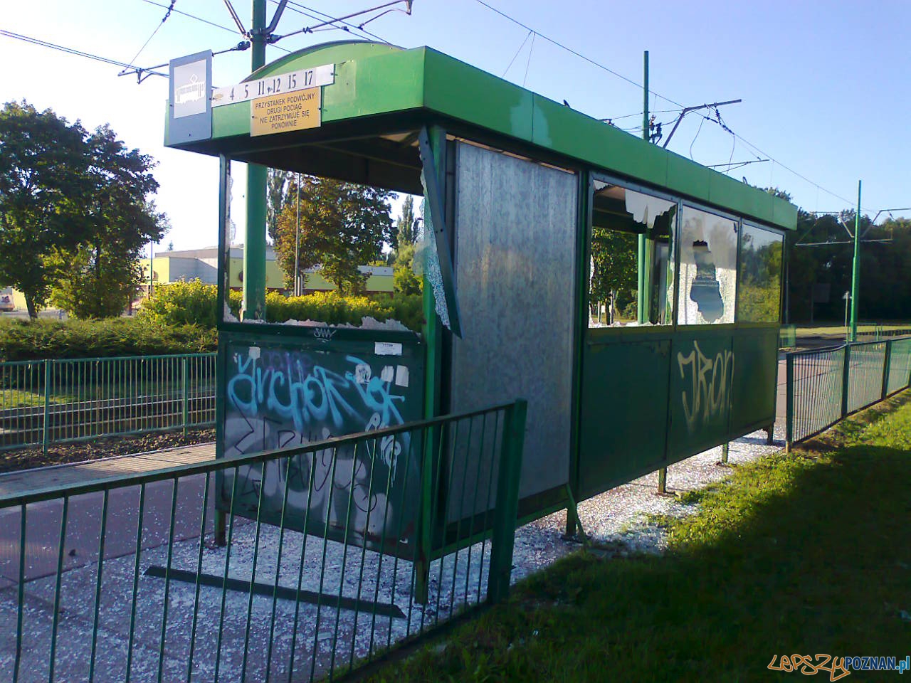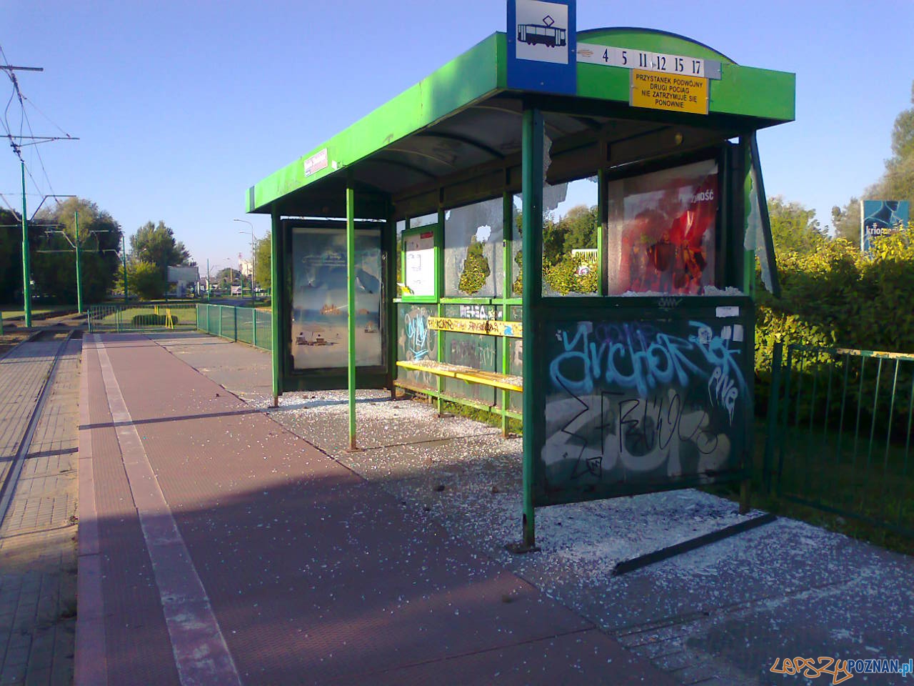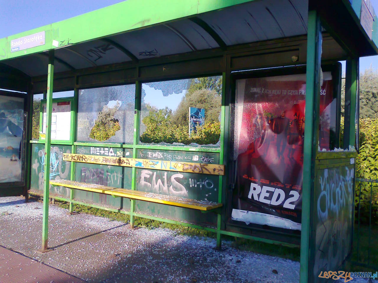 Kolejny przystanek tramwajowy został zniszczony przez jakichś bezmyślnych wandali. Wyżyli się na Rondzie Starołęka rozbijając szyby w wiacie i przewracając betonowy kosz na śmieci. Ten ostatni wystarczy tylko podnieść, ale sama wiata wymaga poważniejszych prac niż wstawienie nowych szyb.
