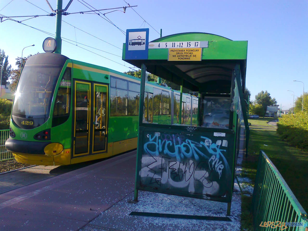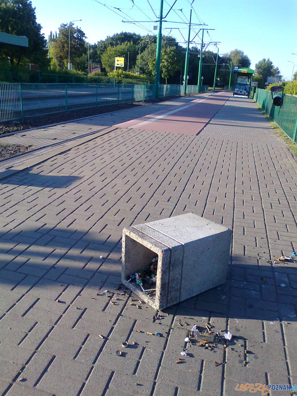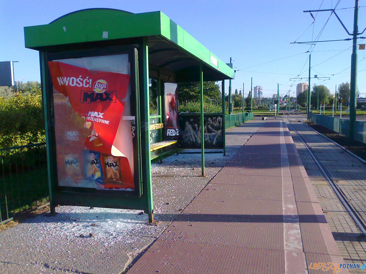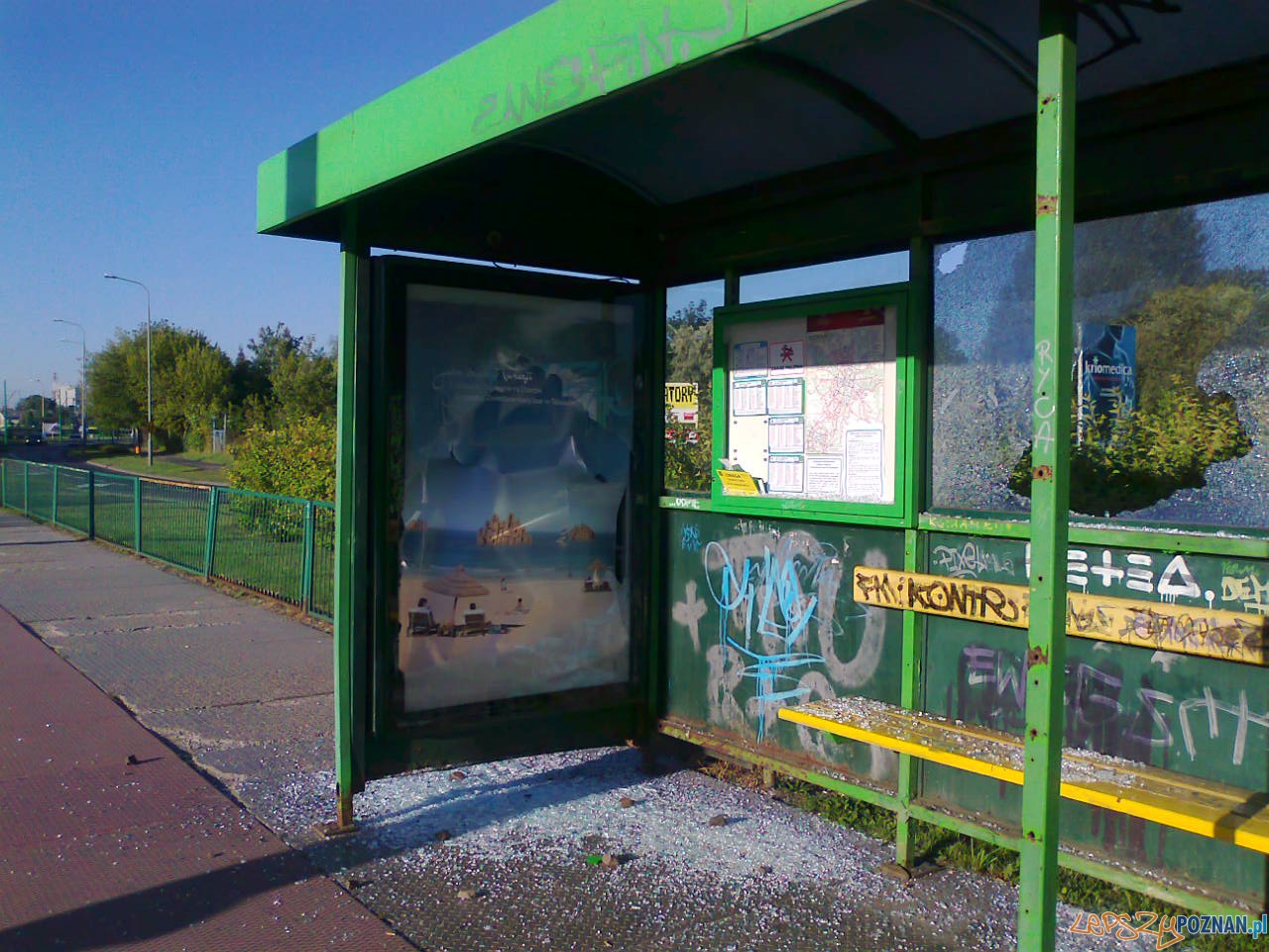 Kolejny przystanek tramwajowy został zniszczony przez jakichś bezmyślnych wandali. Wyżyli się na Rondzie Starołęka rozbijając szyby w wiacie i przewracając betonowy kosz na śmieci. Ten ostatni wystarczy tylko podnieść, ale sama wiata wymaga poważniejszych prac niż wstawienie nowych szyb.